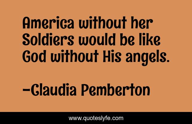 This page presents the quote "America without her Soldiers would be like God without His angels.". Author of this quote is Claudia Pemberton. This quote is about military, soldiers, inspirational, enthusiasm,.