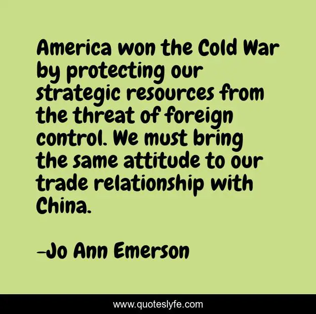 This page presents the quote "America won the Cold War by protecting our strategic resources from the threat of foreign control. We must bring the same attitude to our trade relationship with China.". Author of this quote is Jo Ann Emerson. This quote is about america, war, relationship,.
