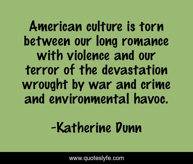 This page presents the quote "American culture is torn between our long romance with violence and our terror of the devastation wrought by war and crime and environmental havoc.". Author of this quote is Katherine Dunn. This quote is about culture, environmental,.