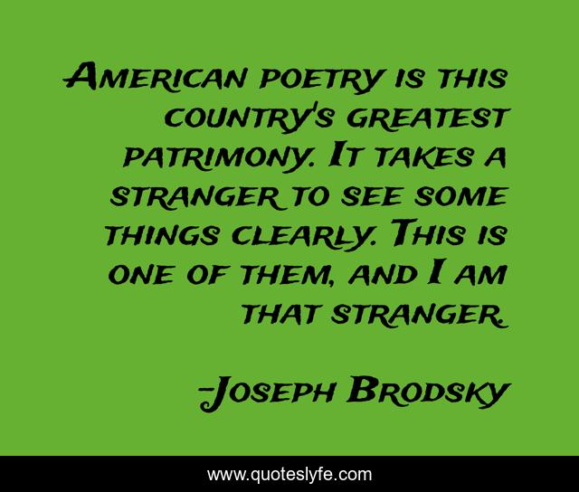 This page presents the quote "American poetry is this country's greatest patrimony. It takes a stranger to see some things clearly. This is one of them, and I am that stranger.". Author of this quote is Joseph Brodsky. This quote is about american, greatest,.