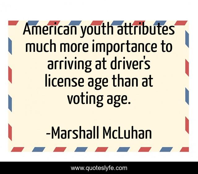 This page presents the quote "American youth attributes much more importance to arriving at driver's license age than at voting age.". Author of this quote is Marshall McLuhan. This quote is about politics, apathy, voting,.