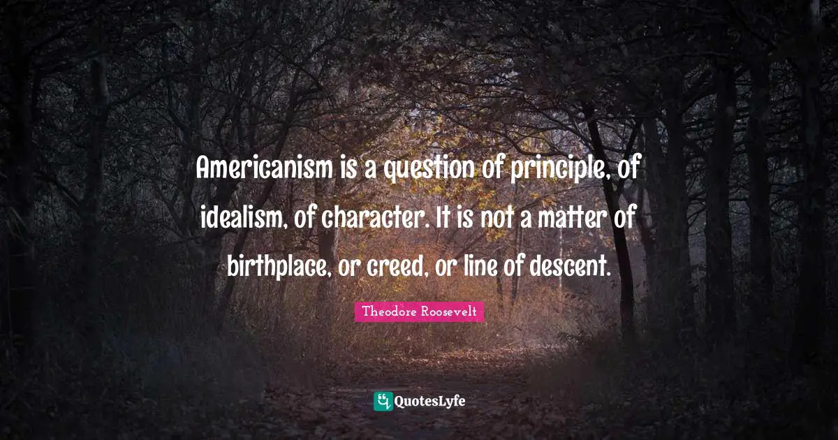 This page presents the quote "Americanism is a question of principle, of idealism, of character. It is not a matter of birthplace, or creed, or line of descent.". Author of this quote is Theodore Roosevelt. This quote is about descent, matter, birth place, character, idealism, americanism, birthplace, principles,.