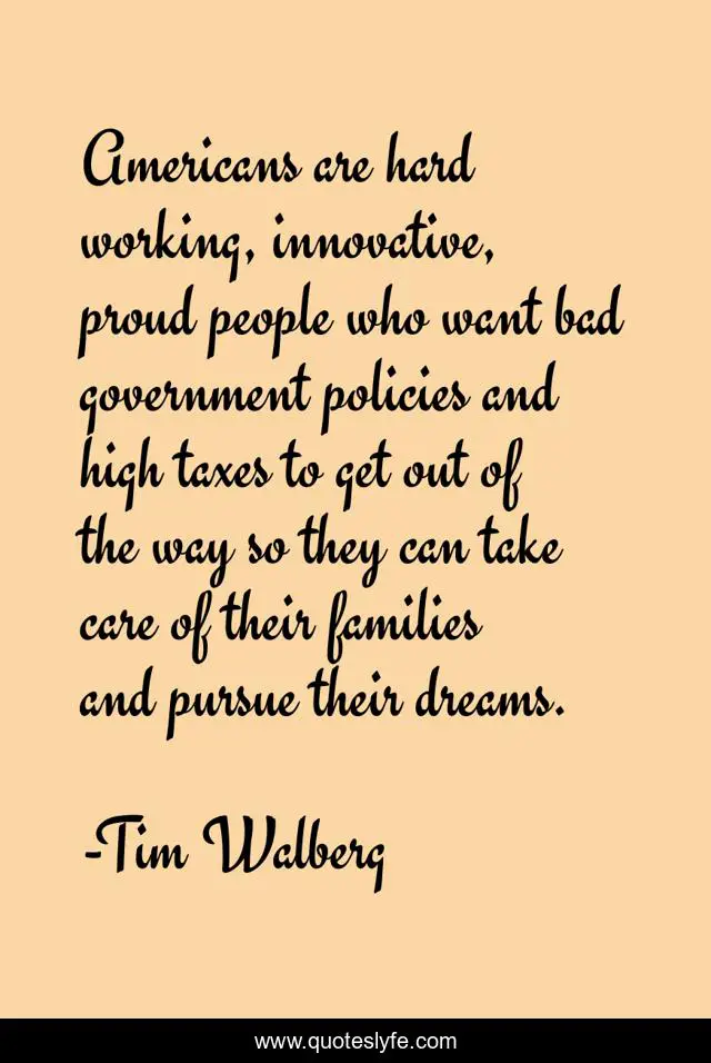 This page presents the quote "Americans are hard working, innovative, proud people who want bad government policies and high taxes to get out of the way so they can take care of their families and pursue their dreams.". Author of this quote is Tim Walberg. This quote is about government, proud, people,.