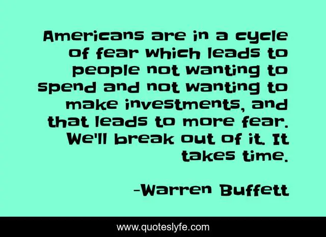 This page presents the quote "Americans are in a cycle of fear which leads to people not wanting to spend and not wanting to make investments, and that leads to more fear. We'll break out of it. It takes time.". Author of this quote is Warren Buffett. This quote is about break, time, people,.