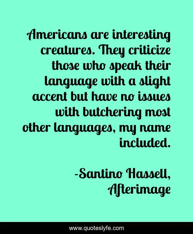 This page presents the quote "Americans are interesting creatures. They criticize those who speak their language with a slight accent but have no issues with butchering most other languages, my name included.". Author of this quote is Santino Hassell, Afterimage. This quote is about culture, american, thierry,.