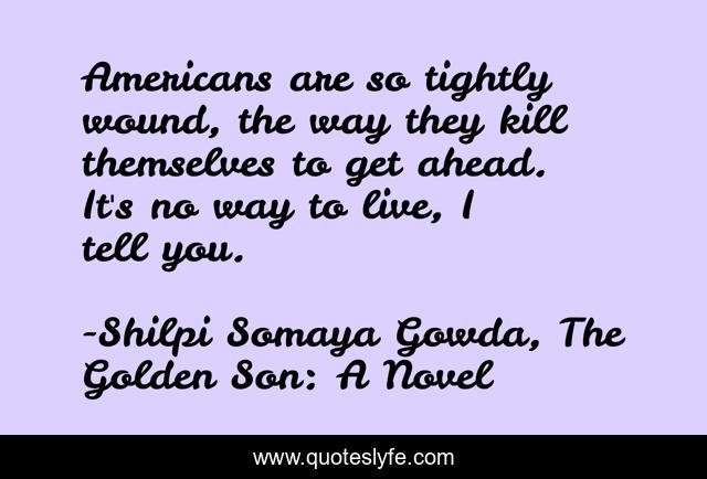 This page presents the quote "Americans are so tightly wound, the way they kill themselves to get ahead. It's no way to live, I tell you.". Author of this quote is Shilpi Somaya Gowda, The Golden Son: A Novel. This quote is about stress, americans, life-lessons,.