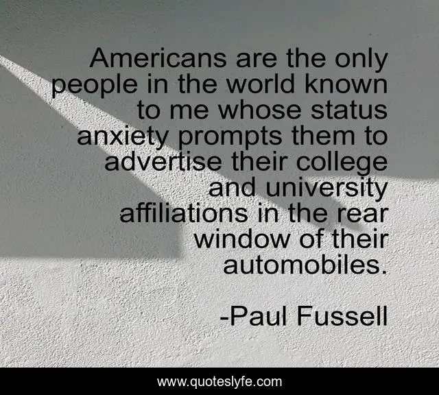 This page presents the quote "Americans are the only people in the world known to me whose status anxiety prompts them to advertise their college and university affiliations in the rear window of their automobiles.". Author of this quote is Paul Fussell. This quote is about world, anxiety, college,.