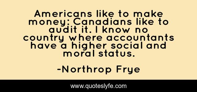 This page presents the quote "Americans like to make money: Canadians like to audit it. I know no country where accountants have a higher social and moral status.". Author of this quote is Northrop Frye. This quote is about canada, canadians,.