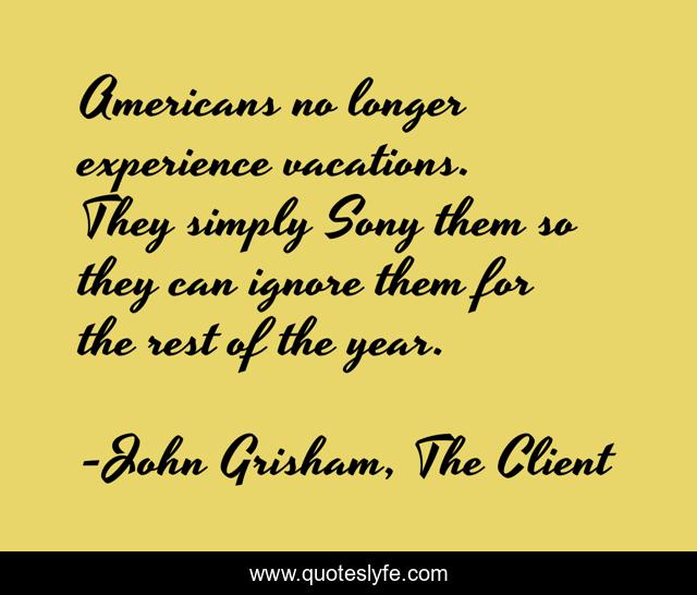"John Grisham, The Client Quotes." Quoteslyfe.com, 2025. Mon. 08 Dec. 2025. <https://www.quoteslyfe.com/quote/Americans-no-longer-experience-vacations-They-simply-196539>.