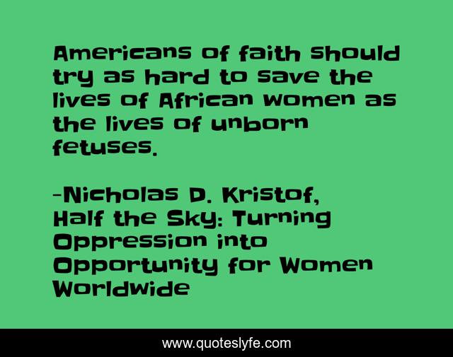 This page presents the quote "Americans of faith should try as hard to save the lives of African women as the lives of unborn fetuses.". Author of this quote is Nicholas D. Kristof, Half the Sky: Turning Oppression into Opportunity for Women Worldwide. This quote is about womens-rights, africa,.