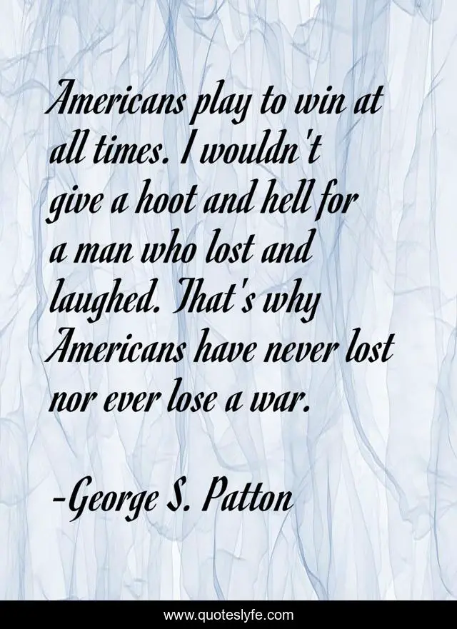 This page presents the quote "Americans play to win at all times. I wouldn't give a hoot and hell for a man who lost and laughed. That's why Americans have never lost nor ever lose a war.". Author of this quote is George S. Patton. This quote is about win, lost, man,.