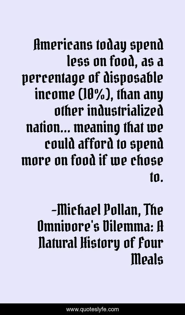 This page presents the quote "Americans today spend less on food, as a percentage of disposable income (10%), than any other industrialized nation... meaning that we could afford to spend more on food if we chose to.". Author of this quote is Michael Pollan, The Omnivore's Dilemma: A Natural History of Four Meals. .