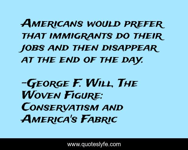 This page presents the quote "Americans would prefer that immigrants do their jobs and then disappear at the end of the day.". Author of this quote is George F. Will, The Woven Figure: Conservatism and America's Fabric. This quote is about pride, racism, ministry,.