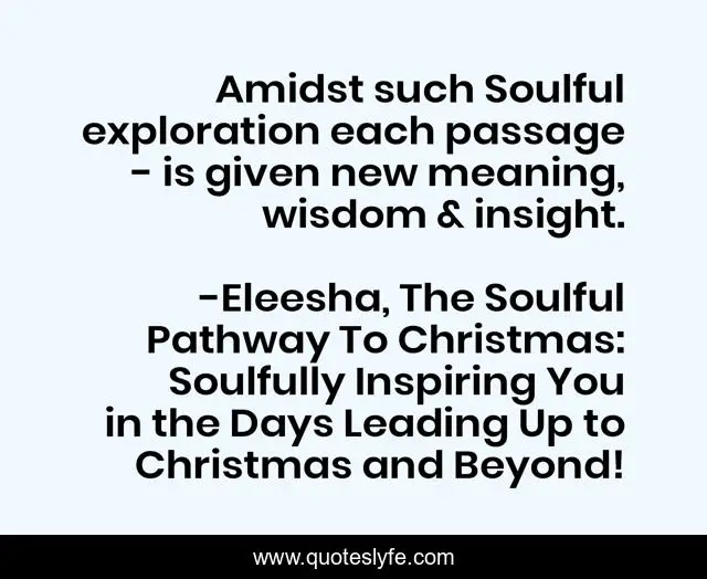 This page presents the quote "Amidst such Soulful exploration each passage - is given new meaning, wisdom & insight.". Author of this quote is Eleesha, The Soulful Pathway To Christmas: Soulfully Inspiring You in the Days Leading Up to Christmas and Beyond!. This quote is about christmas-spirit, positive, motivational, empowerment, soul, quotes, channeling, inspirational, affirmations,.