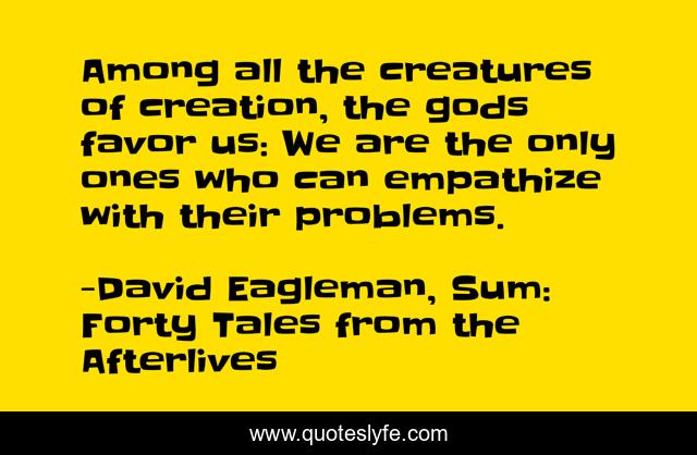 This page presents the quote "Among all the creatures of creation, the gods favor us: We are the only ones who can empathize with their problems.". Author of this quote is David Eagleman, Sum: Forty Tales from the Afterlives. This quote is about existentialism, creation, empathy, human, god,.