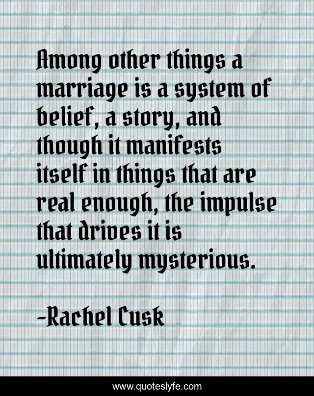 This page presents the quote "Among other things a marriage is a system of belief, a story, and though it manifests itself in things that are real enough, the impulse that drives it is ultimately mysterious.". Author of this quote is Rachel Cusk. .