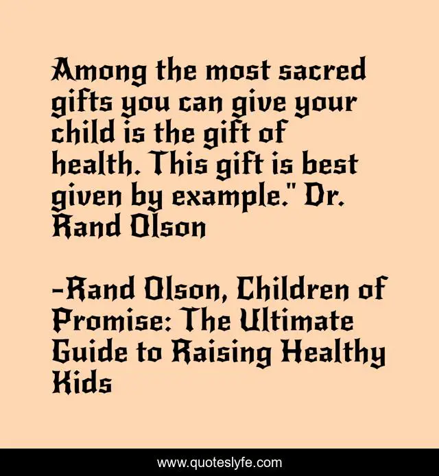 This page presents the quote "Among the most sacred gifts you can give your child is the gift of health. This gift is best given by example." Dr. Rand Olson". Author of this quote is Rand Olson, Children of Promise: The Ultimate Guide to Raising Healthy Kids. This quote is about parenting, healthy-kids, health,.