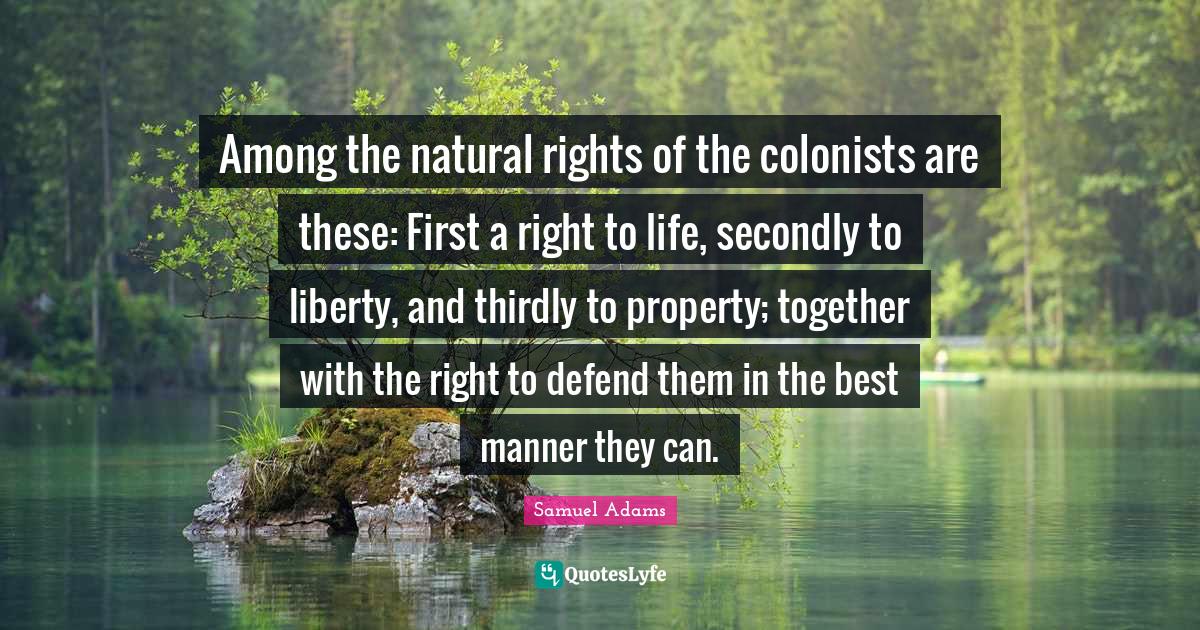 This page presents the quote "Among the natural rights of the colonists are these: First a right to life, secondly to liberty, and thirdly to property; together with the right to defend them in the best manner they can.". Author of this quote is Samuel Adams. This quote is about colonists, property, together, rights, liberty, right to life, natural rights,.