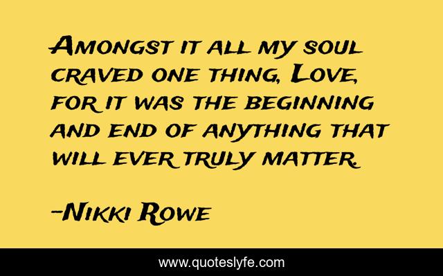 This page presents the quote "Amongst it all my soul craved one thing, Love, for it was the beginning and end of anything that will ever truly matter.". Author of this quote is Nikki Rowe. This quote is about desire, life, love, soul, matter, purpose, affection,.