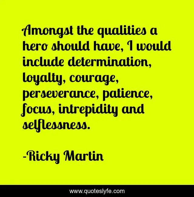 This page presents the quote "Amongst the qualities a hero should have, I would include determination, loyalty, courage, perseverance, patience, focus, intrepidity and selflessness.". Author of this quote is Ricky Martin. This quote is about perseverance, courage, hero,.