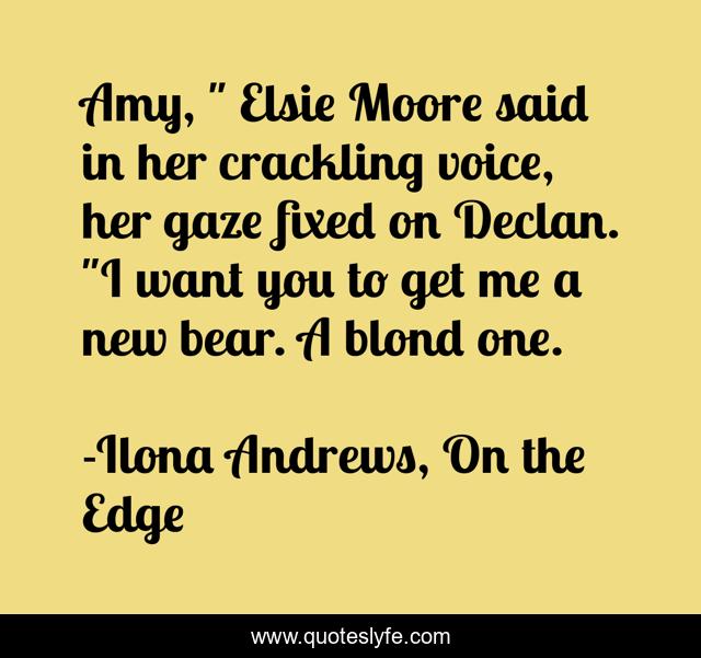 This page presents the quote "Amy, " Elsie Moore said in her crackling voice, her gaze fixed on Declan. "I want you to get me a new bear. A blond one.". Author of this quote is Ilona Andrews, On the Edge. This quote is about humor, paranormal-romance,.