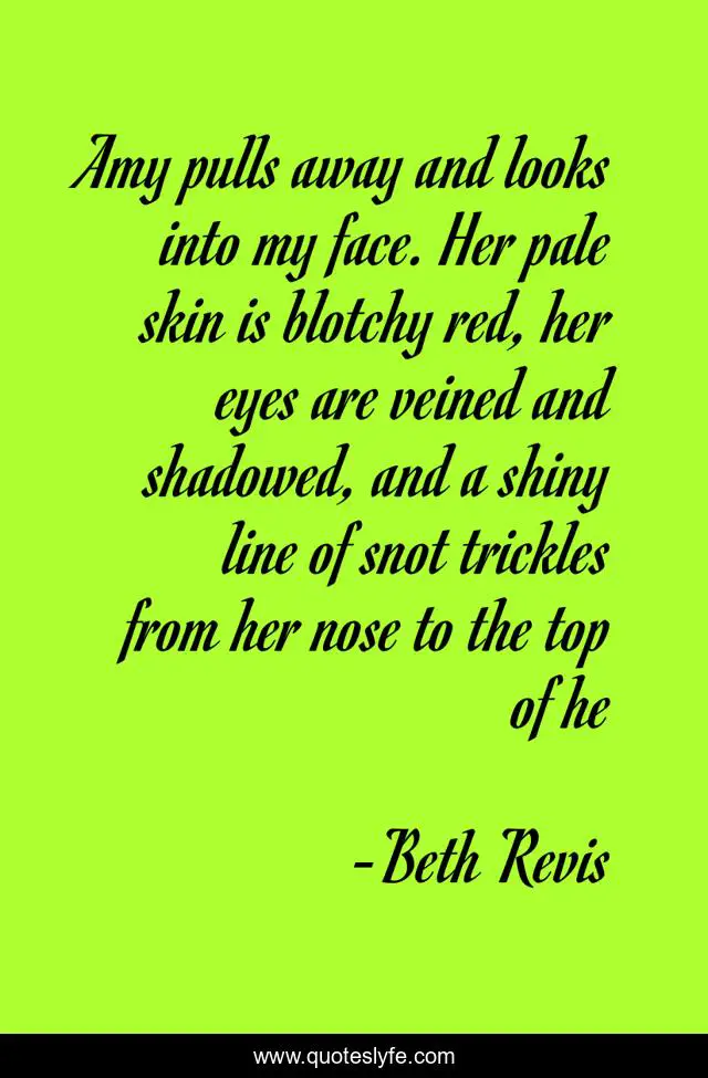 This page presents the quote "Amy pulls away and looks into my face. Her pale skin is blotchy red, her eyes are veined and shadowed, and a shiny line of snot trickles from her nose to the top of he". Author of this quote is Beth Revis. This quote is about amy, beautiful, elder,.