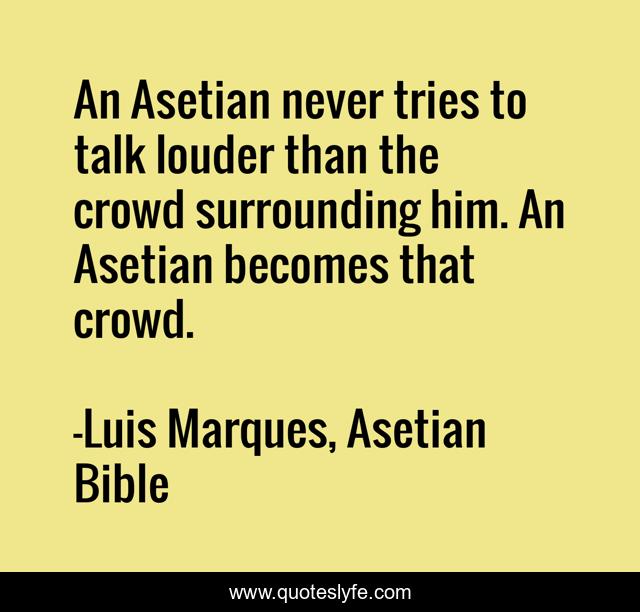 This page presents the quote "An Asetian never tries to talk louder than the crowd surrounding him. An Asetian becomes that crowd.". Author of this quote is Luis Marques, Asetian Bible. This quote is about occult, kemet, magic, book-of-orion, power, asetian-bible, ak, magical, magick,.