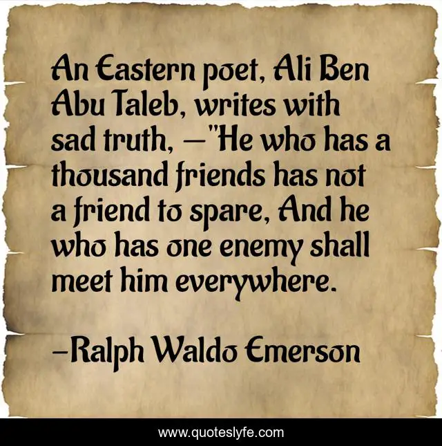 This page presents the quote "An Eastern poet, Ali Ben Abu Taleb, writes with sad truth, —"He who has a thousand friends has not a friend to spare, And he who has one enemy shall meet him everywhere.". Author of this quote is Ralph Waldo Emerson. .
