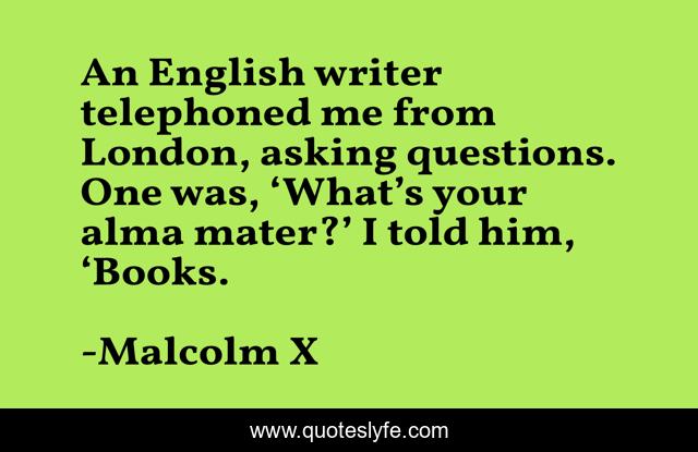 This page presents the quote "An English writer telephoned me from London, asking questions. One was, ‘What’s your alma mater?’ I told him, ‘Books.". Author of this quote is Malcolm X. This quote is about book, books, education,.