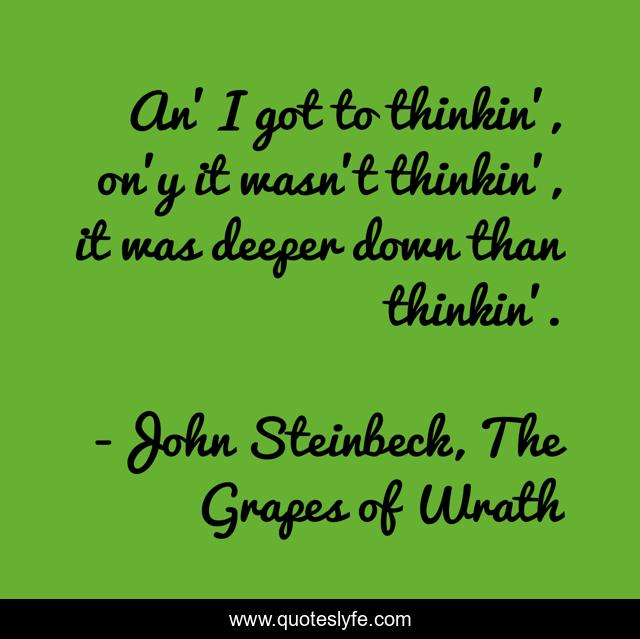 This page presents the quote "An' I got to thinkin', on'y it wasn't thinkin', it was deeper down than thinkin'.". Author of this quote is John Steinbeck, The Grapes of Wrath. This quote is about john-steinbeck, mgg, the-grapes-of-wrath, thoughts, thinking,.