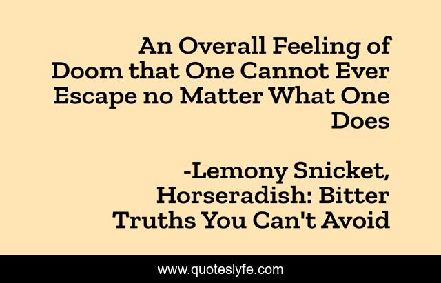This page presents the quote "An Overall Feeling of Doom that One Cannot Ever Escape no Matter What One Does". Author of this quote is Lemony Snicket, Horseradish: Bitter Truths You Can't Avoid. This quote is about feeling, pain, truths, snicket, truth, escape, terror, fear, doom,.