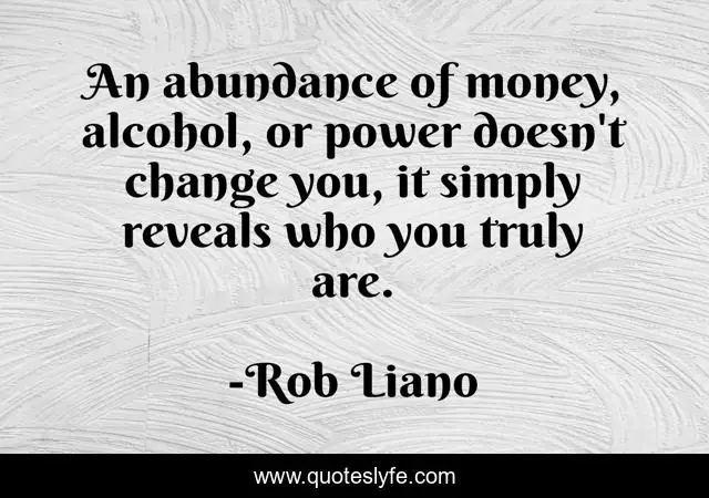 This page presents the quote "An abundance of money, alcohol, or power doesn't change you, it simply reveals who you truly are.". Author of this quote is Rob Liano. This quote is about abundance, motivation, power, wake-up-call, money, acohol, personal-assessment, self-help, personal-development,.