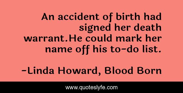 This page presents the quote "An accident of birth had signed her death warrant.He could mark her name off his to-do list.". Author of this quote is Linda Howard, Blood Born. This quote is about warriors, paranormal-urban-fantasy, vampires, conduits,.