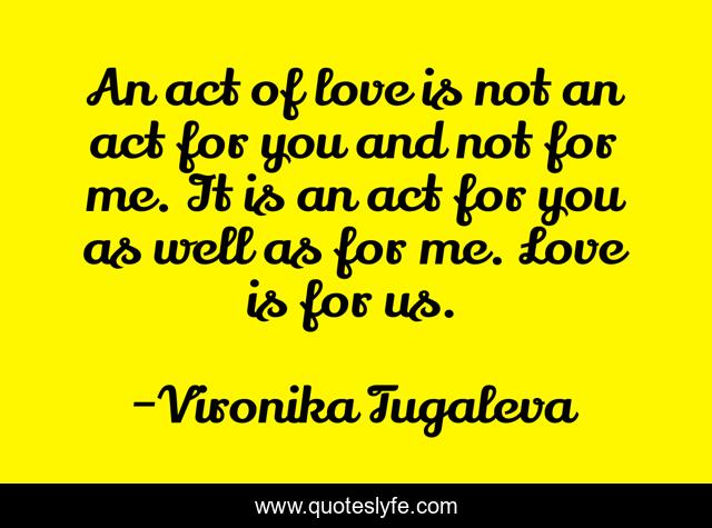 This page presents the quote "An act of love is not an act for you and not for me. It is an act for you as well as for me. Love is for us.". Author of this quote is Vironika Tugaleva. This quote is about action, relationships, love, unconditional-love, affection,.