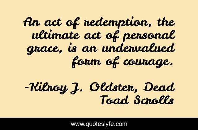 This page presents the quote "An act of redemption, the ultimate act of personal grace, is an undervalued form of courage.". Author of this quote is Kilroy J. Oldster, Dead Toad Scrolls. This quote is about courage-in-life, courage, grace, redemption,.
