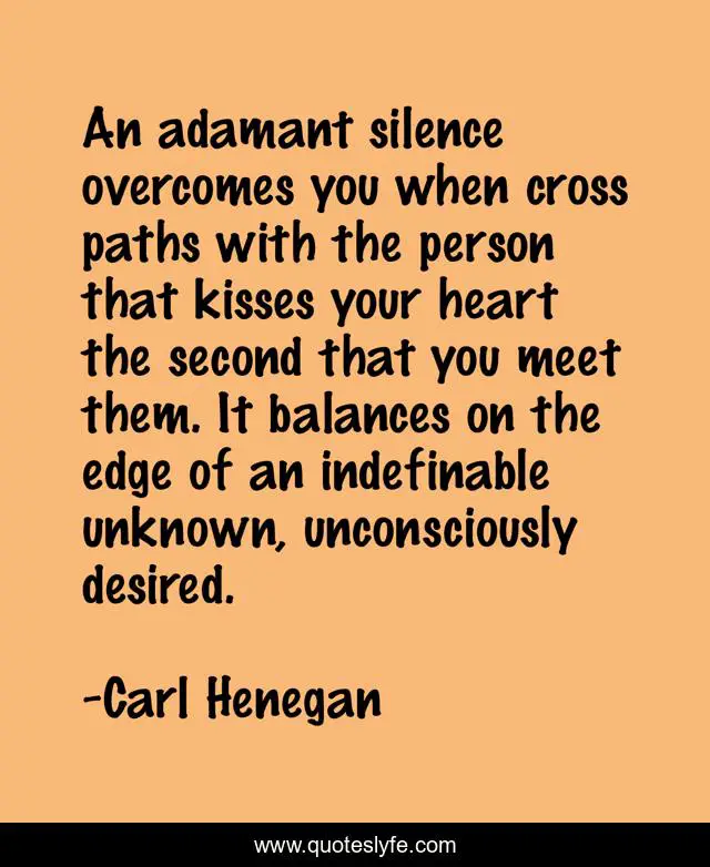 This page presents the quote "An adamant silence overcomes you when cross paths with the person that kisses your heart the second that you meet them. It balances on the edge of an indefinable unknown, unconsciously desired.". Author of this quote is Carl Henegan. This quote is about desire, heart, love, unknown, silence, affection,.