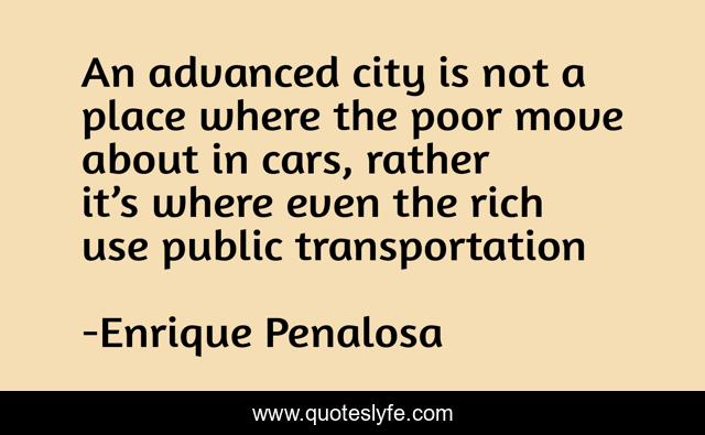 This page presents the quote "An advanced city is not a place where the poor move about in cars, rather it’s where even the rich use public transportation". Author of this quote is Enrique Penalosa. This quote is about city, traffic, transport, urban,.