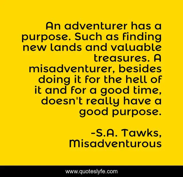 This page presents the quote "An adventurer has a purpose. Such as finding new lands and valuable treasures. A misadventurer, besides doing it for the hell of it and for a good time, doesn't really have a good purpose.". Author of this quote is S.A. Tawks, Misadventurous. This quote is about good-time, australia, treasure, adventure, queensland, purpose,.