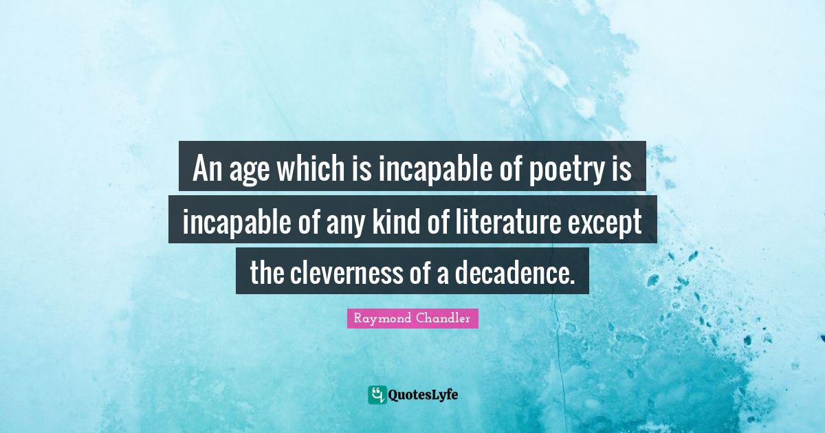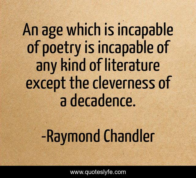 This page presents the quote "An age which is incapable of poetry is incapable of any kind of literature except the cleverness of a decadence.". Author of this quote is Raymond Chandler. This quote is about kind, literature, poetry,.