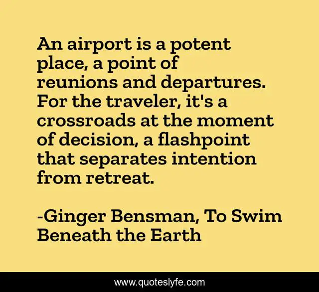 This page presents the quote "An airport is a potent place, a point of reunions and departures. For the traveler, it's a crossroads at the moment of decision, a flashpoint that separates intention from retreat.". Author of this quote is Ginger Bensman, To Swim Beneath the Earth. This quote is about enthusiasm, travel, change, inspirational,.