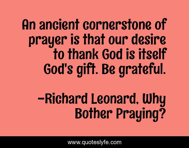 This page presents the quote "An ancient cornerstone of prayer is that our desire to thank God is itself God's gift. Be grateful.". Author of this quote is Richard Leonard, Why Bother Praying?. This quote is about gratitude, pray, prayer, thanksgiving, grateful-heart, gratefulness, thankfulness, praying, give-thanks,.