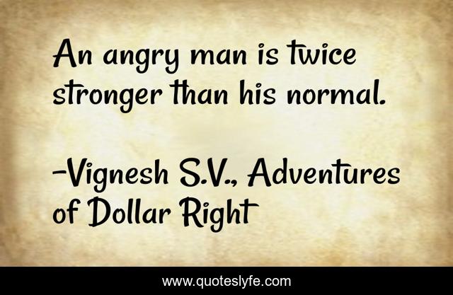 This page presents the quote "An angry man is twice stronger than his normal.". Author of this quote is Vignesh S.V., Adventures of Dollar Right. This quote is about anger, dangerous, angry,.