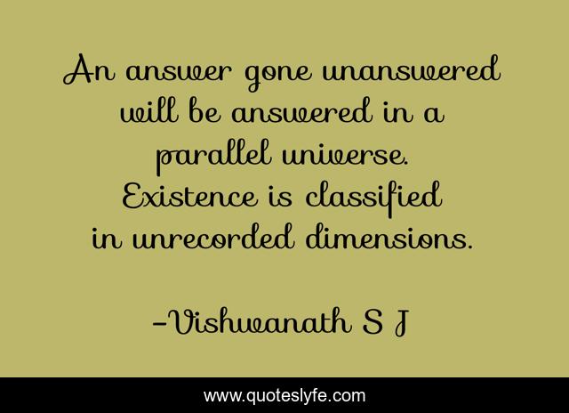 This page presents the quote "An answer gone unanswered will be answered in a parallel universe. Existence is classified in unrecorded dimensions.". Author of this quote is Vishwanath S J. This quote is about chapter, life, philosophy, dark-matter, quote, parallel-universes, insecurity, time-travel, mind,.