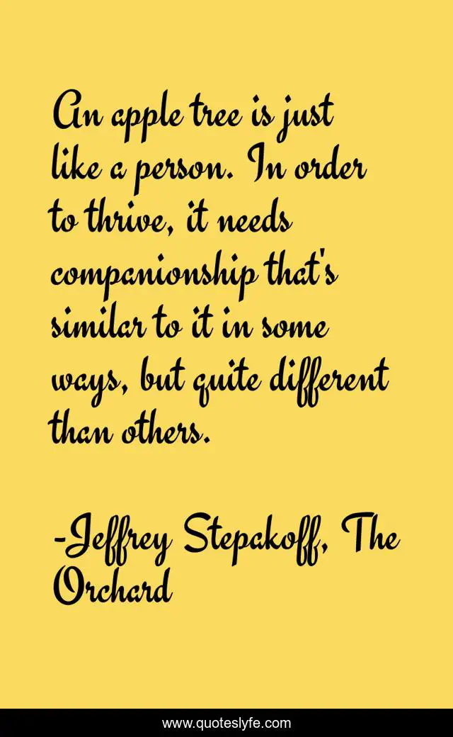 This page presents the quote "An apple tree is just like a person. In order to thrive, it needs companionship that's similar to it in some ways, but quite different than others.". Author of this quote is Jeffrey Stepakoff, The Orchard. This quote is about relationships, apples, companionship,.