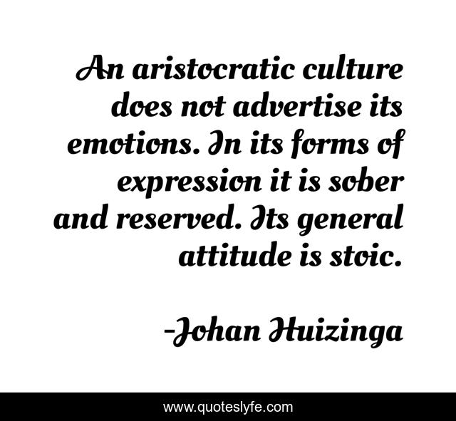 This page presents the quote "An aristocratic culture does not advertise its emotions. In its forms of expression it is sober and reserved. Its general attitude is stoic.". Author of this quote is Johan Huizinga. This quote is about culture, emotions,.