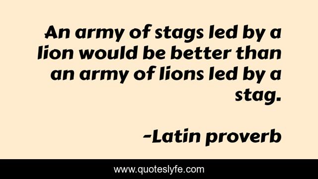 This page presents the quote "An army of stags led by a lion would be better than an army of lions led by a stag.". Author of this quote is Latin proverb. .