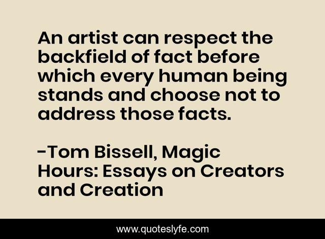This page presents the quote "An artist can respect the backfield of fact before which every human being stands and choose not to address those facts.". Author of this quote is Tom Bissell, Magic Hours: Essays on Creators and Creation. This quote is about facts, art, history,.