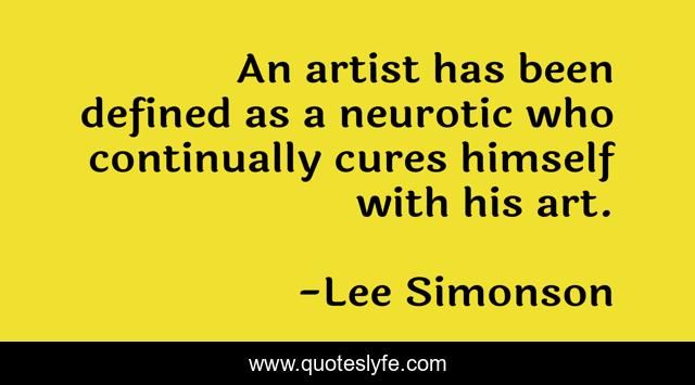 This page presents the quote "An artist has been defined as a neurotic who continually cures himself with his art.". Author of this quote is Lee Simonson. This quote is about art, artist,.