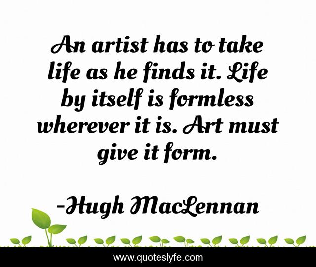 This page presents the quote "An artist has to take life as he finds it. Life by itself is formless wherever it is. Art must give it form.". Author of this quote is Hugh MacLennan. This quote is about art, artist,.