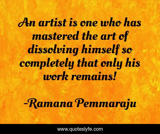 This page presents the quote "An artist is one who has mastered the art of dissolving himself so completely that only his work remains!". Author of this quote is Ramana Pemmaraju. This quote is about art, creativity, dissolve, artists,.